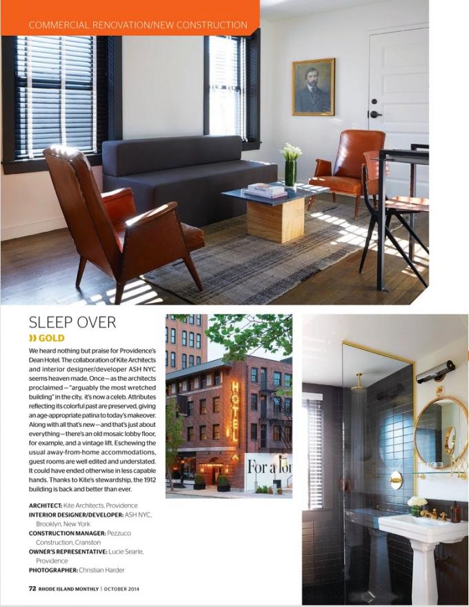 Once again, KITE Architects is thrilled to be recognized in RI Monthly’s Annual Design Competition, this time earning the Gold level award for their work to help create The Dean Hotel. The project also won a 2014 Rhody Award from Preserve RI and the RI Historic Preservation and Heritage Commission, and will receive an award from the Providence Preservation Society. Click here for a great summary of the project and a link to the before and after slideshow.